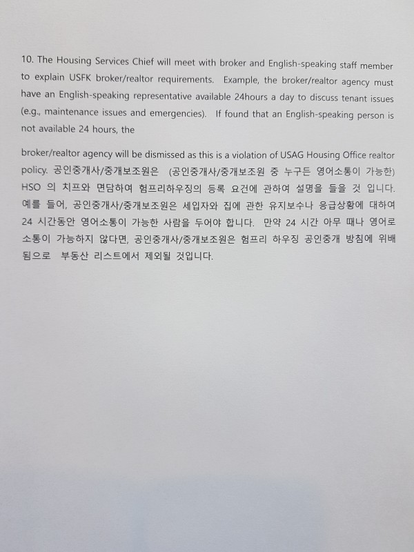 10. The Housing Services Chief will meet with broker and English-speaking staff member to explain USFK broker/realtor requirements. Example, the broker/realtor agency must have an English-speaking representative available 24hours a day to discuss tenant issues (e.g., maintenance issues and emergencies). If found that an English-speaking person is not available 24 hours, the