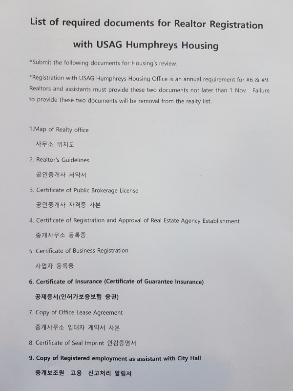 *Registration with USAG Humphreys Housing Office is an annual requirement for #6 & #9. Realtors and assistants must provide these two documents not later than 1 Nov. Failure to provide these two documents will be removal from the realty list.
